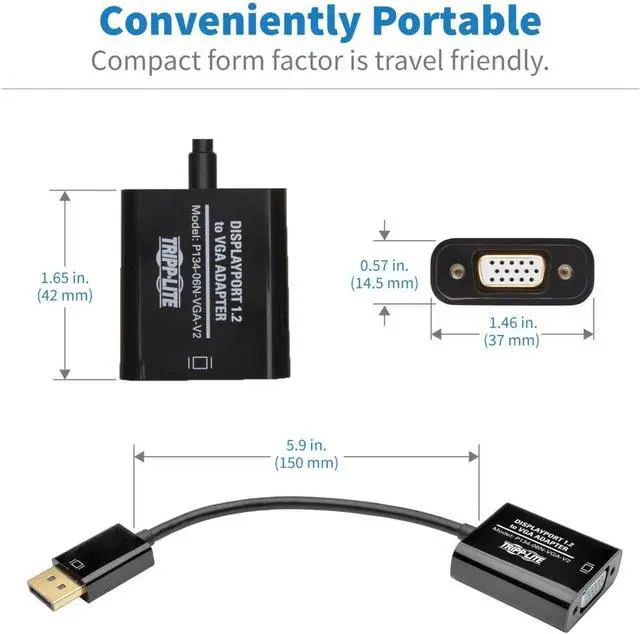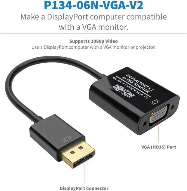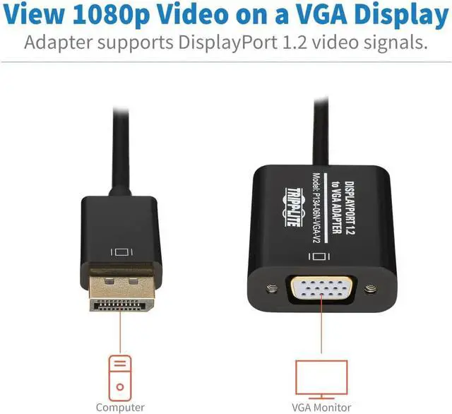 Connects a DisplayPort 1. 2 computer to VGA-enabled monitor, projector or TV