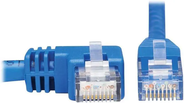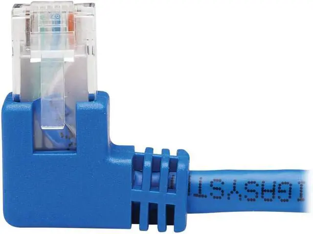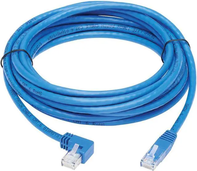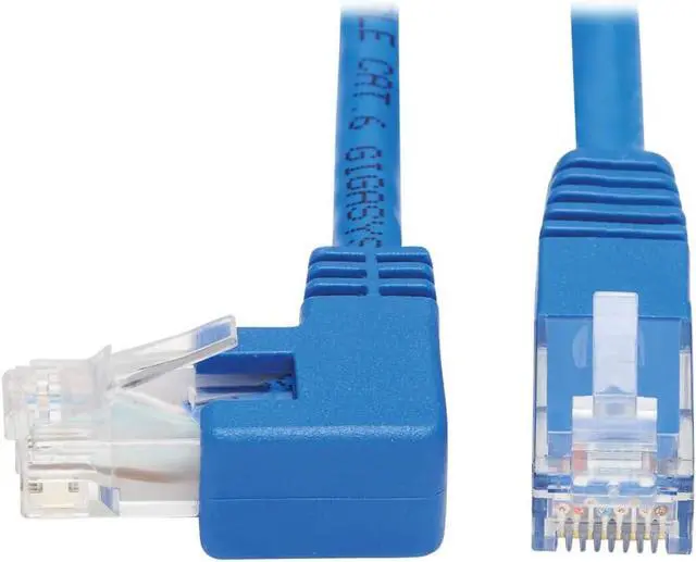 Left-Angle: One RJ45 male connector is at a 90-degree left angle, preventing excessive bending and reducing stress on the cable. Distribute data, voice and video at higher speeds with Tripp Lites Category 6 molded UTP patch cable. Length: 20 ft. / Color: Blue / Connectors: RJ45 Right-Angle Left Male to RJ45 Male