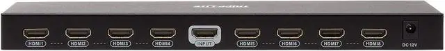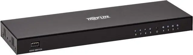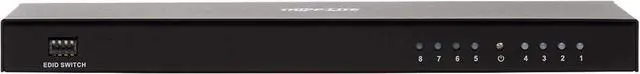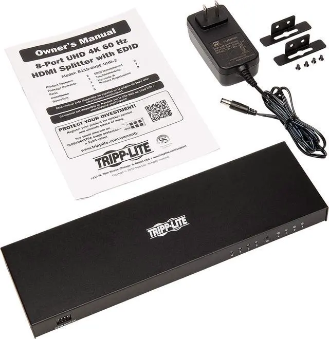 HDMI Splitter Transmits 4K Video + Audio to 8 HDMI Displays at the Same Time Recommended for home theaters or short-distance digital signage applications in classrooms, showrooms, offices, churches, restaurants, bars, hotels and trade shows, this Ultra High Definition (UHD) HDMI splitter is quick and easy to install. It connects to an HDMI source device, such as a computer or Blu-ray player, and transmits a true 4K audio/video signal to eight HDMI monitors, projectors or televisions simultaneously. You can cascade up to three levels of splitters, which expands the total number of connected displays to 512. Note : The B118-008E-UHD-2 sends the same image to all connected displays. If you would like to extend an image over multiple displays, you will need an MST hub, such as the B156-002-HD-V2. Supports UHD 4K x 2K Signals up to 15 ft. via HDMI Cabling Using standard 28 AWG HDMI cable, the B118-008E-UHD-2 distributes a 4K audio/video signal (at 60 Hz) up to 15 feet (4.6 meters). Be sure the HDMI cables connecting the splitter to the source and displays are no longer than 15 feet. For best performance, we recommend using Tripp Lite's P569-Series HDMI cables. Supports Up-To-Date Features and Formats The B118-008E-UHD-2 supports a wide range of audio formats, including DTS-HD, Dolby TrueHD, Dolby Digital Plus and LPCM 7.1-channel surround sound. It also features lip sync pass-through, 36-bit Deep Color, xvYCC and x.vColor, while receiving and transmitting up to 18 Gbps of bandwidth with no data loss. To ensure compatibility with the latest hardware, this splitter is compliant with HDCP 2.2 and 3D standards. User-Adjustable EDID Settings Gives You Control over A/V Resolutions EDID (Extended Display Identification Data) allows the source device to identify the capabilities of each connected display and transmit to the highest video and audio resolutions shared by all displays. The B118-008E-UHD-2's default EDID setting uses the lowest level of video format shared by the displays (for instance, if two monitors support 4K video and one supports 1080p, all three monitors will show 1080p). In the event you want to override the automatic detection setting and control the audio/video output yourself, you may do so by adjusting the built-in DIP switches. Ready to Use Right Out of the Package The plug-and-play B118-008E-UHD-2 requires no additional software or drivers. Connect your devices to the HDMI ports with user-supplied HDMI cables (such as Tripp Lite's P569-Series), and plug the included external power supply into an AC power source to get started. An amber LED indicates the unit is receiving power, and blue LEDs indicate connected HDMI inputs. Use the included hardware to install the unit on a desktop or mount it to a wall.