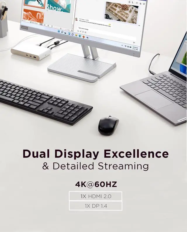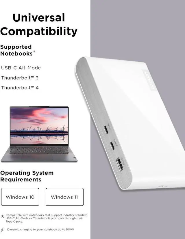 "Experience a new era of laptop charging with unprecedented speed and efficiency, all wrapped in the sleek elegance of the Lenovo 500 USB-C Universal Dock. With the capability to charge your laptop at an impressive 100W, you'll never wait long for your device to power up. Our cutting-edge 135W Power Adapter has been designed with precision to deliver the optimal power required for lightning-fast 100W laptop charging. And that's not all this advanced technology also supports rapid charging for qualified laptops, ensuring you stay powered up and productive. Seamless compatibility meets limitless possibilities when you connect your compatible Windows 10 and later laptops to the Lenovo 500 Dock. Say goodbye to compatibility woes and hello to a smooth, hassle-free user experience. This dock is the bridge that effortlessly connects your laptop to a world of productivity-enhancing features. Elevate your workspace aesthetics with the Lenovo 500 Dock's modern glossy moon white exterior, accentuated by a brushed metal front panel design. This fusion of style and functionality not only adds a touch of elegance to your desk setup but also reflects your commitment to environmentally conscious choices. We've taken innovation a step further by constructing 40% of the dock's external shell from recycled plastic materials, making it a visual masterpiece with a purpose. The Lenovo 500 USB-C Universal Dock transforms into your ultimate hybrid work companion, seamlessly adapting to both office and home environments. With just one cable connection, unleash the potential of dual 4K monitors, supercharge your laptop with rapid 100W charging, and enjoy lightning-fast data transfers. Gone are the days of cluttered desks and complicated setups this dock streamlines your workspace and enhances your productivity in one fell swoop."
