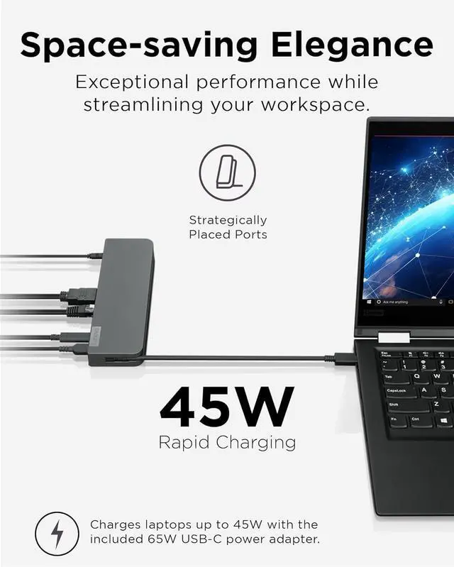 Unlock Your Potential with a Versatile Mini Dock; Lenovo recognizes the diversity of modern business computing needs, spanning different PC models and brands. To simplify this, the Lenovo USB-C Mini Dock offers compatibility not only with Lenovo notebooks but also with those from HP and Dell.