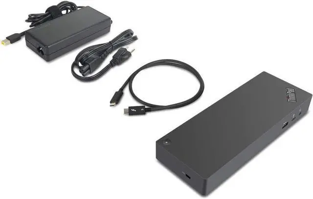 In the Box - Lenovo Brand Black Docking station, 135W Lenovo Power Adapter and Power Cord, Thunderbolt 3 cable, Documentation.