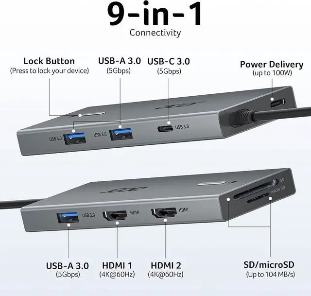 9 in 1 Laptop Docking StationAcer laptop docking station comes with 2*HDMI, 3*5Gbps USB A ports, 1*5Gbps USB C, 1*PD 100W charging and SD/Micro SD card slot up to 104 Mbps (Note: No Display Port ! ). Connect multiple devices with just one docking station, saving desk space by reducing messy wires. At the same time, support for monitors and storage devices streamlines the setup, keeping your workspace clean and organized.