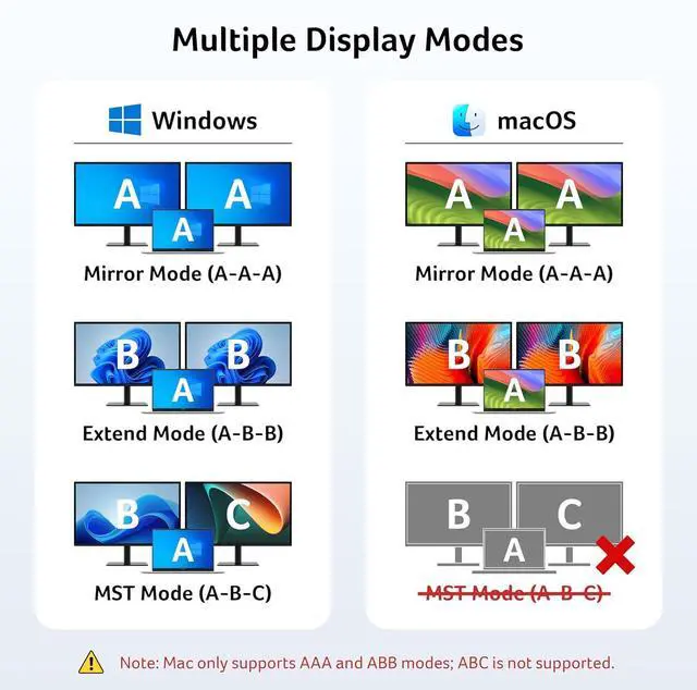 Stunning Dual 4K DisplayThis USB-C docking station features dual HDMI ports to stream or mirror content in crystal-clear resolution. Designed to expand screen space for seamless multi-window workflows and flexible screen splitting, this hdmi splitter for dual monitors is ideal for multitasking professionals.Note: MAC OS can Only Extend One Monitor for Extend mode.