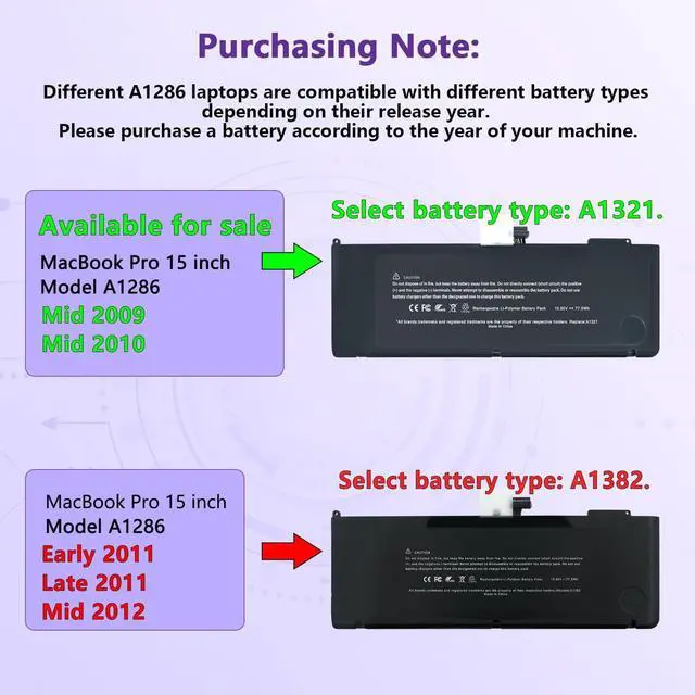 Compatible with Laptop ModelMacBook Pro 15.4" inch Model A1286 (Mid 2009) version Compatible with Laptop Model(Mid 2009) MB985LL/A MB985*/A, MB986LL/A MB986*/A, MB986LL/A MB986*/A MC118LL/A MC118*/ACompatible with Laptop ModelMacBook Pro 15.4" inch Model A1286 (Mid 2010) version:Compatible with Laptop ModelMC371LL/A MC371*/A MC372LL/A MC372*/A MC373LL/A MC373*/ANote Please be sure that this listing is A1321 battery Only for Macbook pro 15" mid 2009 and mid 2010 version! COMPATIBILITY BATTERY MODEL LIST: