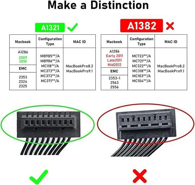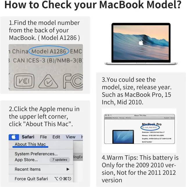 1.Before you purchase, please confirm that your MacBook's model number, the original battery's part number and your MacBook's version correctly match this replacement battery.