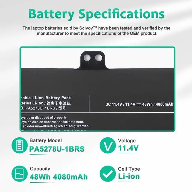• LONG-LASTING BATTERY LIFE: With 11.4V capacity (48Wh / 4080mAh ), the ( PA5278U-1BRS ) battery ensures all-day power for your laptops in a factory-fresh, never-used battery pack designed for maximum performance.