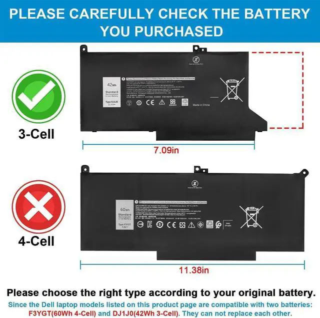 Dell Latitude (7490 7390 7290 7480 7380 7280) laptops are compatible with 2 battery types: [F3YGT 4-Cell, 60Wh] or [DJ1J0 3-Cell, 42Wh]. Please open the back cover of your laptop to check the original battery size and capacity before placing an order.