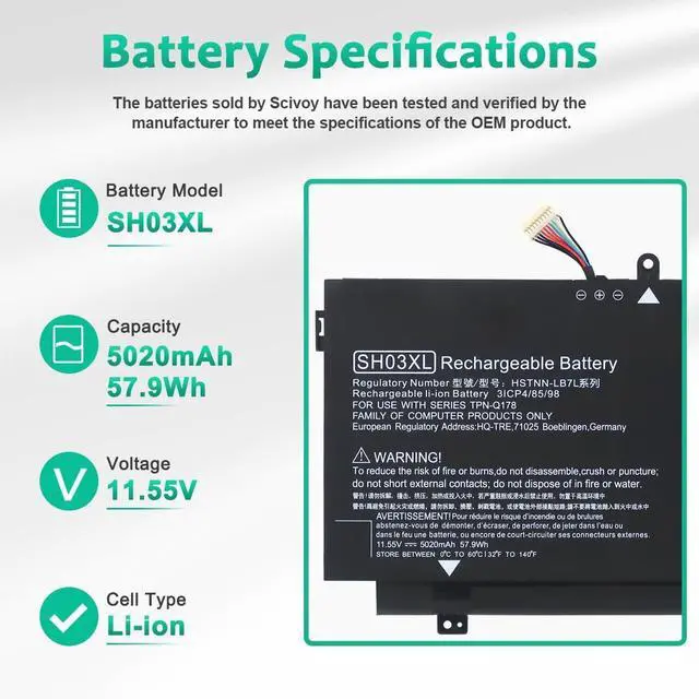 LONG-LASTING BATTERY LIFE- With 11.55V capacity ( 57.9Wh/5020mAh ), the ( SH03XL ) battery ensures all-day power for your laptops in a factory-fresh, never-used battery pack designed for maximum performance.
