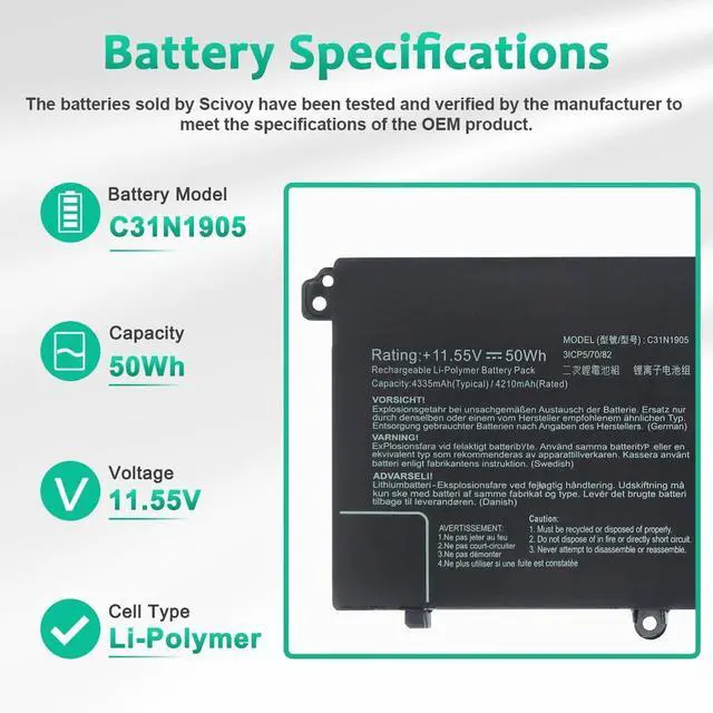 LONG-LASTING BATTERY LIFE:With 11.55V,capacity (50Wh/4335mAh/3-Cell),the(C31N1905) battery ensures all-day power for your laptops in a factory-fresh, never-used battery pack designed for maximum performance.