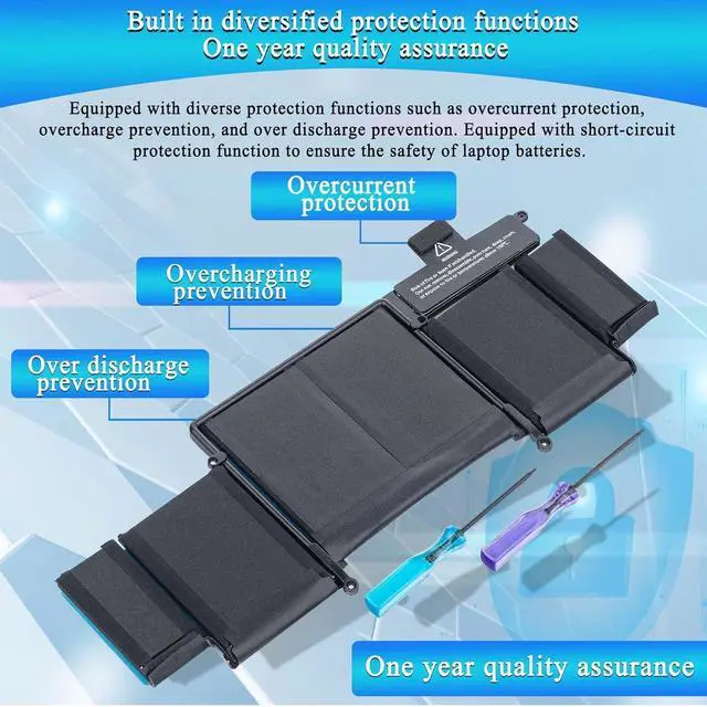 Product Parameters and Quality Material: Battery type: Lithium Polymer; Voltage: 11.42V; Capacity: 74.9Wh/8559mAh; Operation time: Around 1.5-3 hours. Our A1502 laptop batteries are made of high quality materials and assembled with circuit boards to ensure durability and performance. Our A1582 batteries are equipped with A-grade cells that provide up to 500 charge cycles.