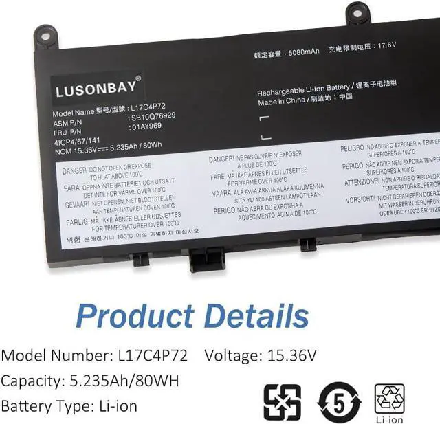 • Replacement Battery Part NumbersGrade A++ cell replacement battery for L17C4P72, SB10Q76929, 01AY969, L17M4P72, SB10Q76928, 01AY968, L18M4P71, SB10S57317, 01YU911, 5B10W13900, 5B10W1389, 5B10W13953, 5B10V98091, TP00099A, TP00099B