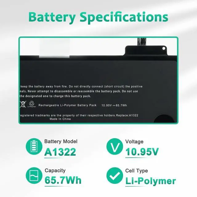 LONG-LASTING BATTERY LIFE: With 10.95V, capacity (65.7Wh), the (A1322) battery ensures all-day power for your laptops in a factory-fresh, never-used battery pack designed for maximum performance.