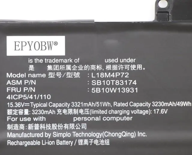 SpecificationsBattery Model: L18M4P72 / Voltage: 15.36V / Capacity: 51Wh 3321mAh 4-Cell / Color: Black / Condition: Brand New.