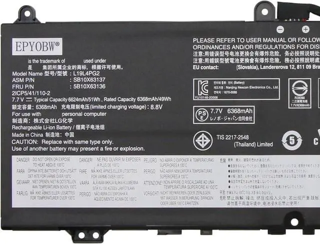 SpecificationsBattery Model: L19L4PG2 / Voltage: 7.7V / Capacity: 51Wh 6624mAh 4-Cell / Color: Black / Condition: Brand New.