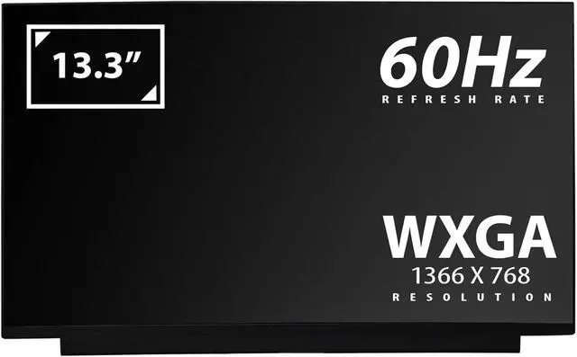 Screen Size: 13.3" HD; Screen Resolution: 1366 X 768 (HD) PIXELS; Screen Finish: Matte; Data Connector: 30 pins (Bottom Right - When Looking at the back of the screen); Please Note: This is a 315MM Wide Screen Without Screw Brackets. Please Test the screen completely before using any adhesive tapes on the screen.