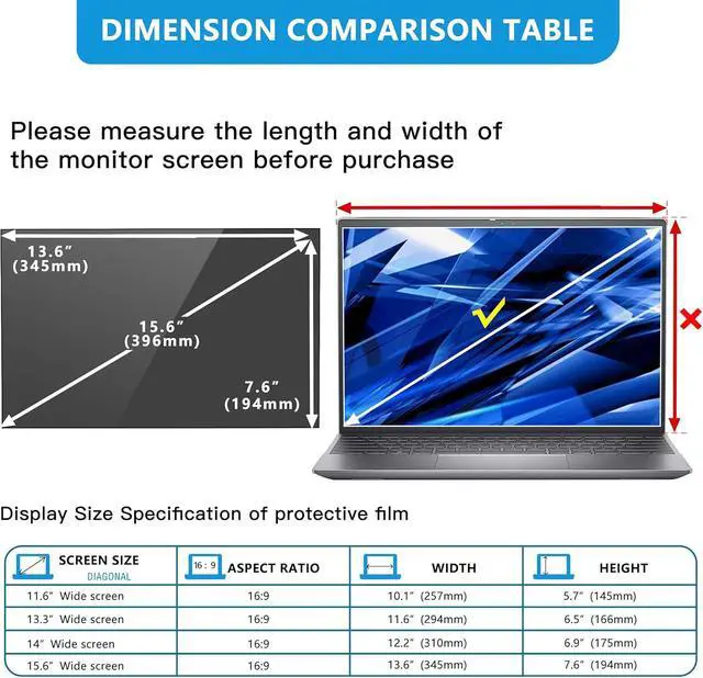 1.FILMEXT high-grade 15.6 inch(16:9) laptop privacy screen is perfectly compatible with HP Pavilion 15.6, HP ChromeBook 15.6, HP Stream 15.6, Acer Chromebook 15.6, Acer Chromebook 314/514, Acer Aspire 15.6, Asus Chromebook C425 and Asus VivoBook 15.6 ,Note: The Filter only covers the display area of your tablet computer screen, not the border area.