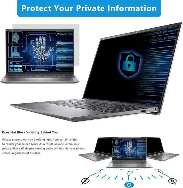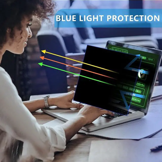 2.Keep Your Eyes & Screen Privacy Safe FILMEXT 15.6 inch laptop privacy screens privacy angle is 30 degrees ±5, transparency is 60%±5, thickness is 0.35mm. Data is only visible in front of the display, appears a darkened or black screen from side view, with anti-glare and blocks 35% blue light feature, protects your eyes and prevents reflection from strong light, reduces stress on your eyes from daily glare & UV light,Blue light and helps protect your screen from damage and dust.