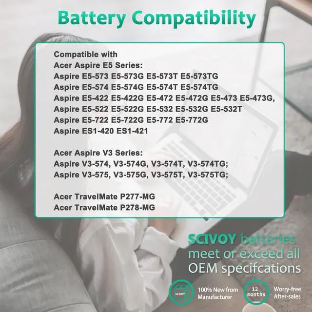 GUARANTEED FIT THESE LAPTOP MODELS- Compatible with Acer Aspire E5 Series: E5-573, E5-573G, E5-573T, E5-573TG, E5-574 E5-574G E5-574T E5-574TG, E5-422 E5-422G, E5-472, E5-472G, E5-473, E5-473G, E5-522, E5-522G, E5-532, E5-532G, E5-532T, E5-722, E5-722G, E5-772, E5-772G; Aspire V3 Series: V3-574G, V3-574T, V3-574TG, V3-575, V3-575G, V3-575T, V3-575TG; TravelMate: P277-MG, P277-MG-7474, P278-MG, P278-MG-76L2.