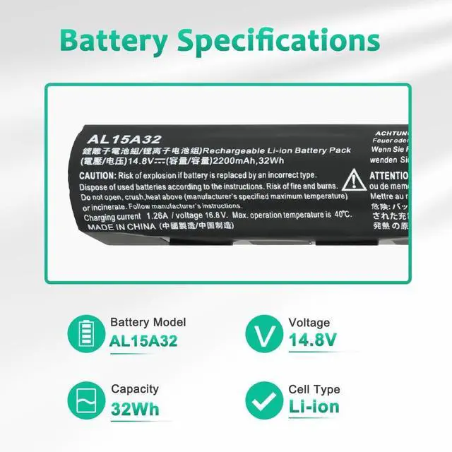 LONG-LASTING BATTERY LIFE- With 14.8V capacity ( 2200mAh/ 32Wh ), the ( AL15A32 ) battery ensures all-day power for your laptops in a factory-fresh, never-used battery pack designed for maximum performance.