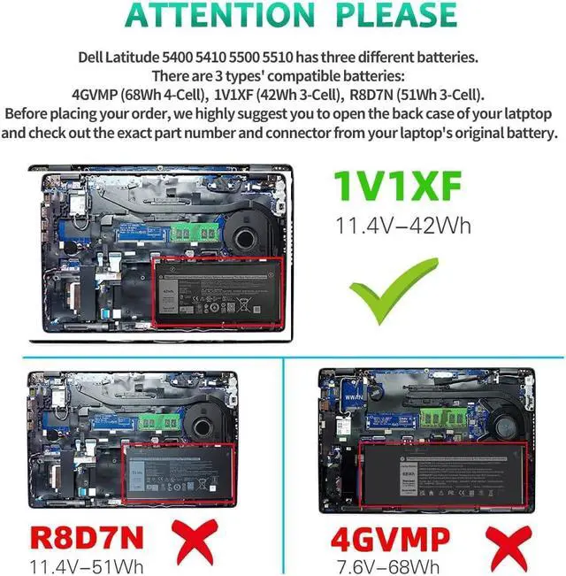 Dell Latitude 5400 5410 5500 5510 are compatible with three battery models. There are 3 types' compatible batteries: 4GVMP (68Wh 4 Cell), 1V1XF(42Wh 3-Cell), R8D7N (51Wh 3-Cell). Before placing your order, we highly suggest you to open the back case of your latptop and check out the exact part-number and connector from your laptop's original battery.