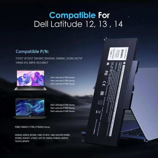 Compatible Laptop Models: 60Wh F3YGT Dell Battery, For Dell Latitude 12 7000 7280 7290, Dell Latitude 13 7000 7380 7390, Dell P28S P28S001, Dell Latitude 14 7000 7480 7490 Series, Dell Latitude E7280 E7380 E7480 E7290 E7390 E7490 Series. (NOT fit for Dell Latitude 7390 2-in-1 Series)F3YGT Laptop Battery For Latitude P73G P28S002 P73G001 P73G002 Series laptop.