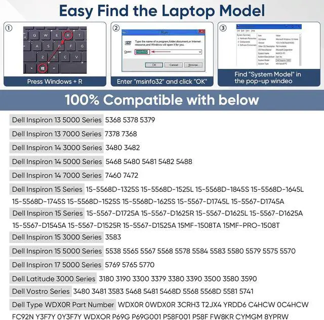 Wide CompatibilityLaptop battery replacement are compatible with Dell Laptop Battery WDX0R P69G001 3CRH3 FC92N T2JX4 C4HCW Y3F7Y Dell Battery 3-cell 42WH 11.4v Li-on WDX0R Dell Battery Dell Inspiron 15 5570 Battery Inspiron 13-7378 battery Inspiron 15-7579 battery Dell Inspiron 5379 Battery Dell Inspiron 5567 Battery Dell Inspiron 13 7000 Battery Dell Inspiron p69g Battery Dell Inspiron 7573 Battery Dell Latitude 3340 3590 Battery Dell Vostro 5568 5468 Series Battery ("Ctrl" + "F" to find your models)
