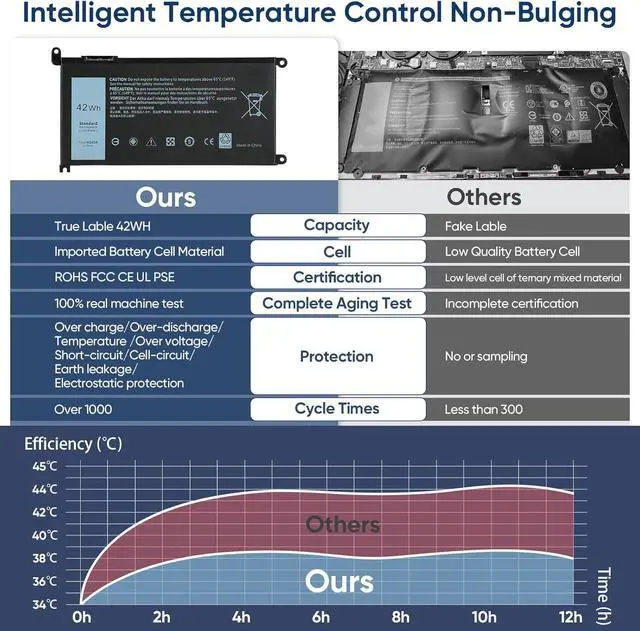 High Performance Even in WinterThe WDX0R battery is equipped with smart chip for temperature control maintain high performance battery life. The smart chip can keep the laptop constant temperature when daily use prevent overheat.
