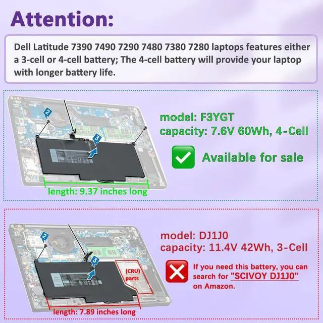 The above laptops are compatible with 2 battery types: [F3YGT 60Wh] or [DJ1J0 42Wh]. The F3YGT battery is 9.37 inches long, while the DJ1J0 battery is 7.89 inches long. Choosing the F3YGT battery will save space on your computer's hard drive.If you need to know about [DJ1J0 3-Cell, 42Wh], please check "DJ1J0 battery" in the chart on this page.This battery is not fit for Dell Latitude 7390 2-in-1. If you are interested in purchasing a replacement battery for Dell Latitude 7390 2-in-1, click on K5XWW Battery in the chart below to view.
