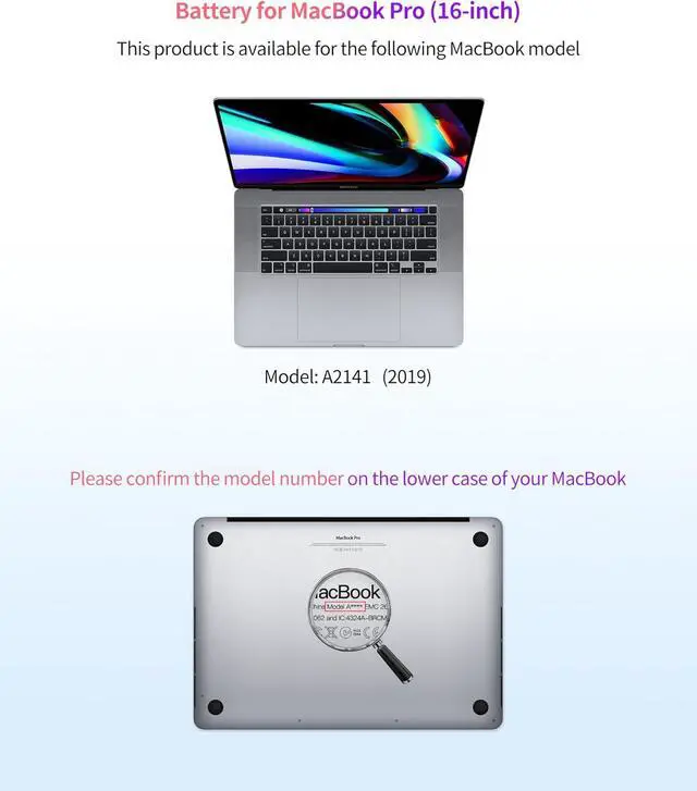 Battery ModelA2113Capacity8700mAh 98.8W hVoltage 11.36VC ompatibleMacBook Pro 16-inch 2019MacBook Model No. A2141Model IdentifierMacBookPro16, 1/MacBookPro16, 4EMC3347Part No. (2019) MVVJ2xx/A, MVVK2xx/A, MVVL2xx/A, MVVM2xx/A