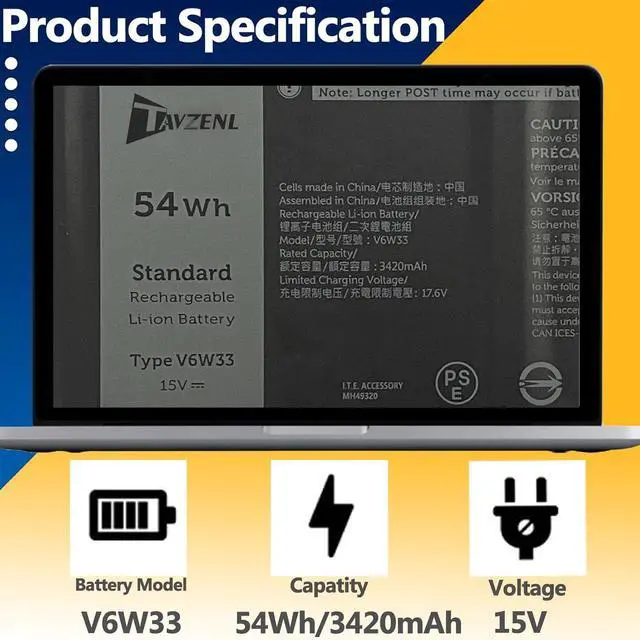 SpecificationsModel: V6W33 Capatity: 54Wh/3420 Voltage:15V Battery type: Rechargeable Battery Color: Black 100% brand New from Manufacturer.