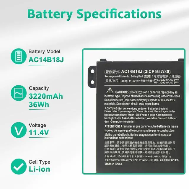 LONG-LASTING BATTERY LIFE: With 11.4V capacity (36Wh/3220mAh), The ( AC14B13J ) battery ensures all-day power for your laptops in a factory-fresh, Never-used battery pack designed for maximum performance.
