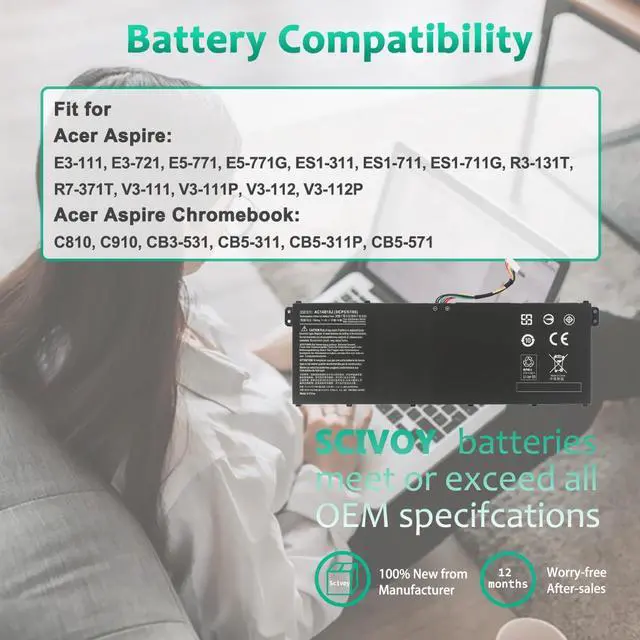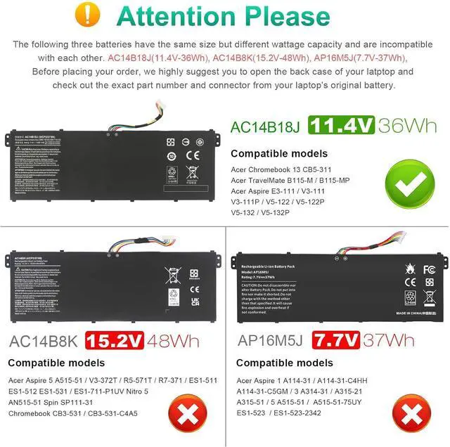GUARANTEED FIT THESE LAPTOP MODELS: Compatible with Acer Aspire E3-111 E3-112 E3-112M Series; for Acer Aspire ES1-511 ES1-512 Series; for Acer Aspire V3-111 V3-111P V5-122 V5-122P V5-132 V5-132P Series; for Acer Chromebook 11 CB3-111 Series; for Acer Chromebook 13 CB5-311 Series; for Acer Chromebook 15 C910 Series; for Acer TravelMate B115-M B115-MP Series; for Acer TravelMate X349 X359 Series; for Acer Gateway NE512 Series; for Acer Swift 3 Series; for Acer Spin 5 Series.
