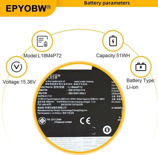 SpecificationsBattery Model: L18M4P72 / Voltage: 15.36V / Capacity: 51Wh 3321mAh 4-Cell / Color: Black / Condition: Brand New.