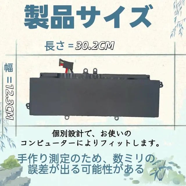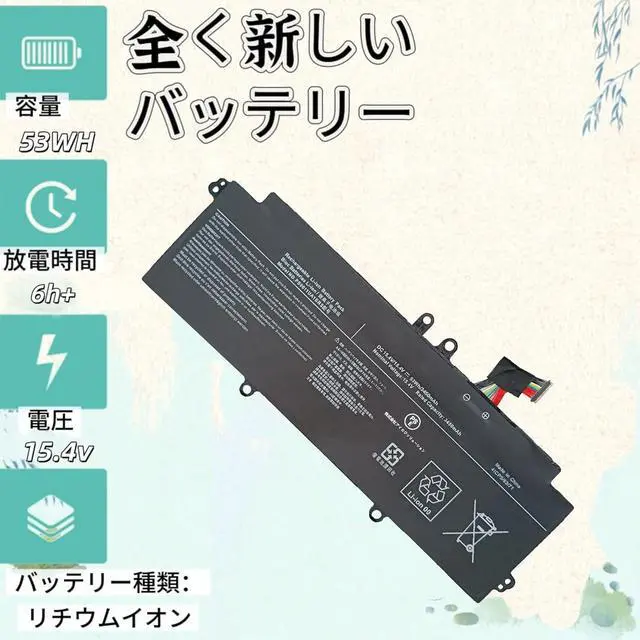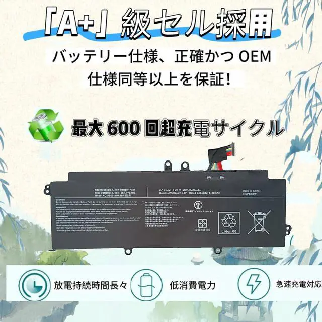 High capacity and long life design; 53 Wh / 3,450 mAh; High capacity specification; Power supply outperforms the genuine product (continuous usage time: about 7 - 9 hours); High density lithium ion battery cells allow the capacity to maintain over 85% even after 500 charges and discharges
