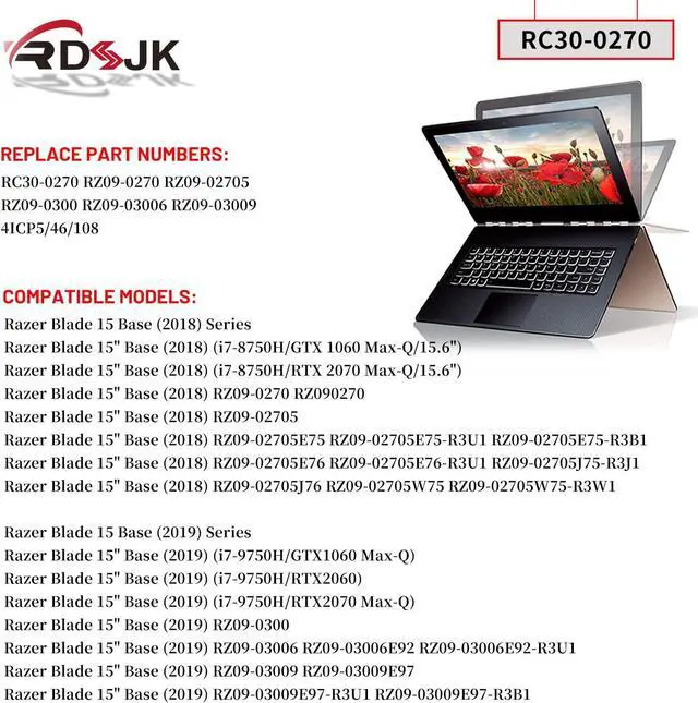 Compatible Models: For Razer Blade 15 Base 2019 Series, For Razer Blade 15 Base 2019 FULL HD 144HZ, For Razer Blade 15 2019 Base (i7-9750H/GTX 1060 Max-Q), For Razer Blade 15 2019 Base (i7-9750H/RTX 2060), For Razer Blade 15 2019 Base (i7-9750H/RTX 2070 Max-Q), For Razer Blade 15 RZ09-0300 RZ090300 RZ09-03006 RZ09-03006E92 RZ09-03006E92-R3U1 RZ09-03009 RZ09-03009E97 RZ09-03009E97-R3U1 RZ09-03009E97-R3B1