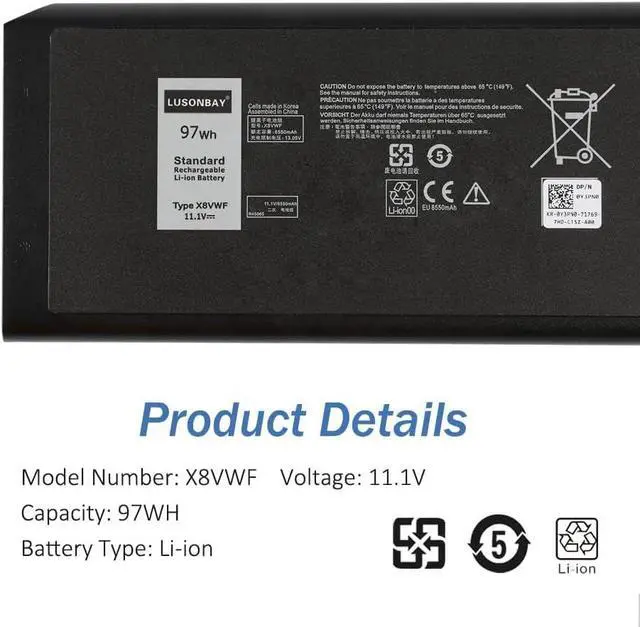 • SpecificationsX8VWF battery for laptop/notebook, laptop battery specifications Voltage: 11.1V, Capacity: 97Wh, Battery Type: Li-ion, Condition:100% Brand New, Cell: Grade "A++" Cell. Each battery will undergo multiple strict test processes before shipping, we strive to bring the highest quality battery to each customer and give your laptop a new lease of life.