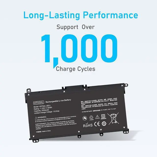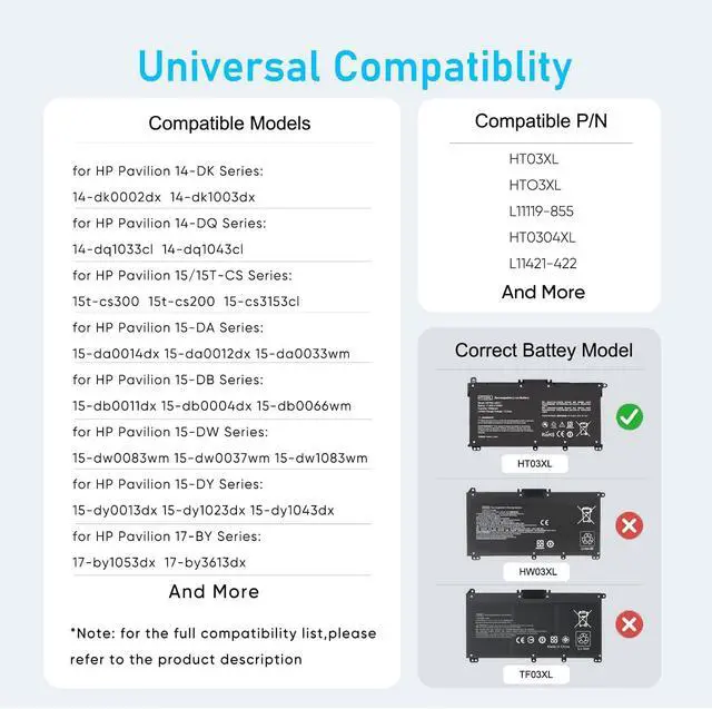 Compatible P/N: HT03XL, HTO3XL, L11119-855, HT03041XL, HSTNN-DB8R, HSTNN-UB7J, L11421-542, L11421-2C2, HSTNN-LB8L, HSTNN-LB8M, and more. Not compatible with HW03XL