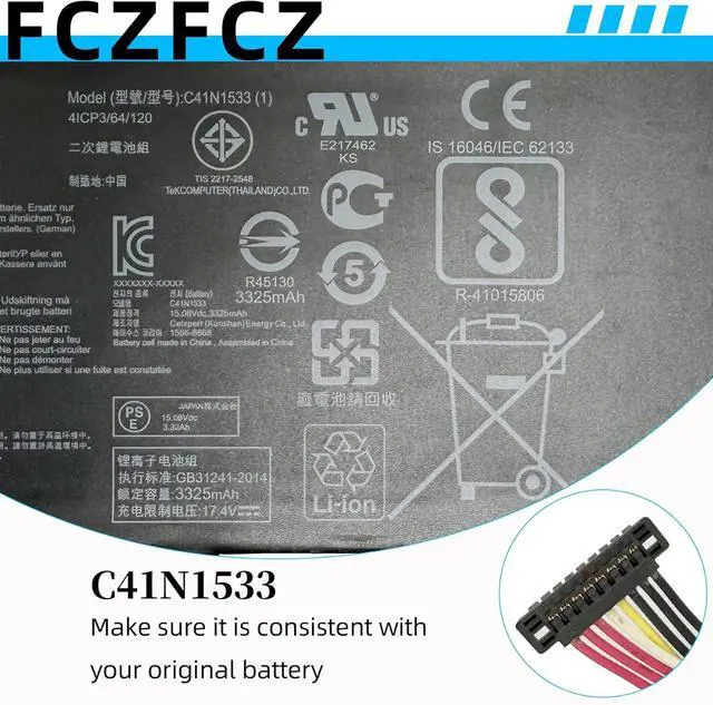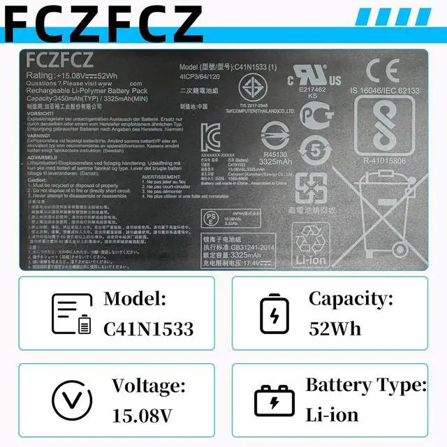 • SpecificationsBattery Model: C41N1533 // Voltage:15.2V // Capacity:52Wh 3450mAh // Color:Black // Condition:Brand New.
