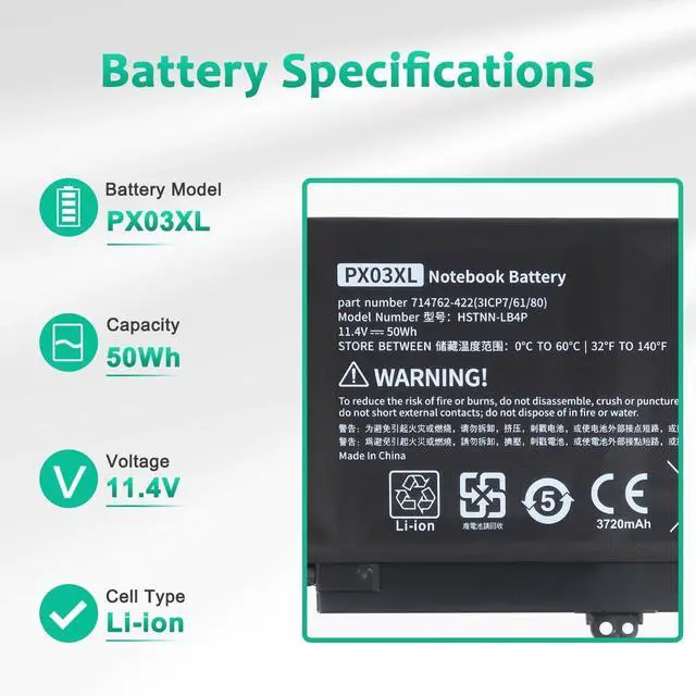 LONG-LASTING BATTERY LIFE:With 11.1V,capacity (50Wh/3-cell),the(PX03XL) battery ensures all-day power for your laptops in a factory-fresh, never-used battery pack designed for maximum performance.