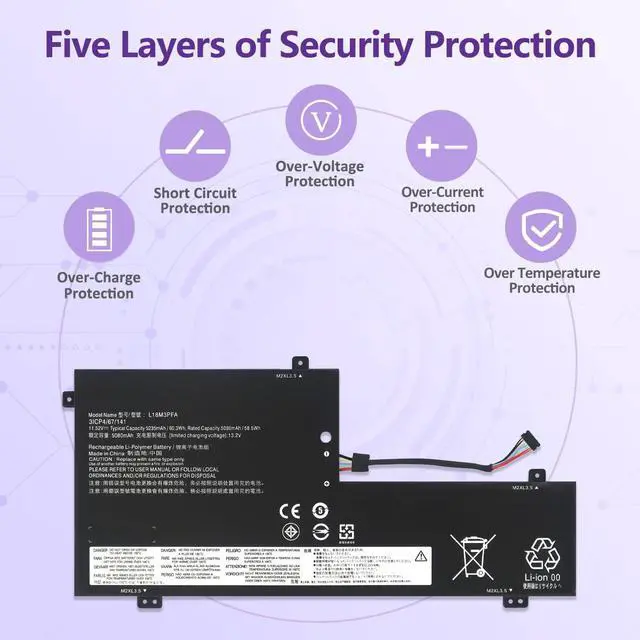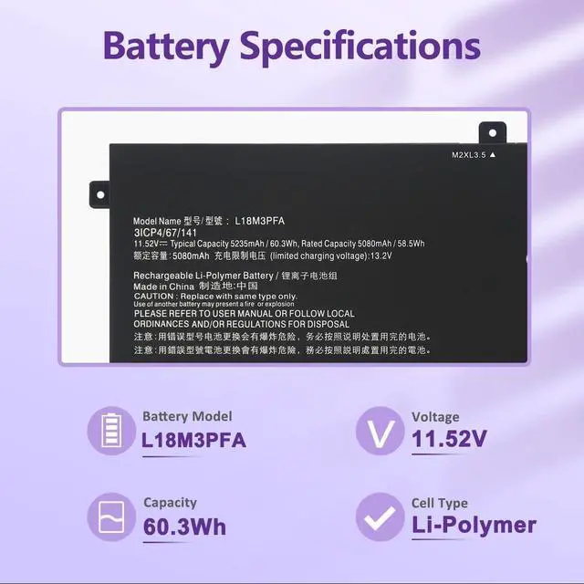 Long-Lasting Battery Life: With 11.52Vcapacity (60.3Wh/5235mAh), the (L18D3PF2) battery ensures all-day power for your laptops in a factory-fresh, never-used battery pack designed for maximum performance.