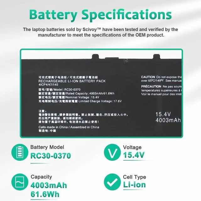 LONG-LASTING BATTERY LIFE- With 15.4V capacity ( 65Wh/4221mAh ), the ( RC30-0270 ) battery ensures all-day power for your laptops in a factory-fresh, never-used battery pack designed for maximum performance.