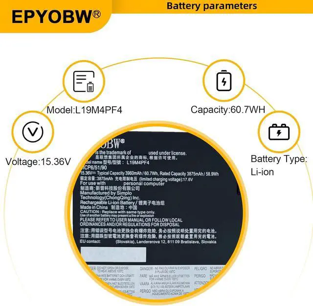 SpecificationsBattery Model: L19M4PF4 / Voltage: 15.36V / Capacity: 60.7Wh 3960mAh 4-Cell / Color: Black / Condition: Brand New.