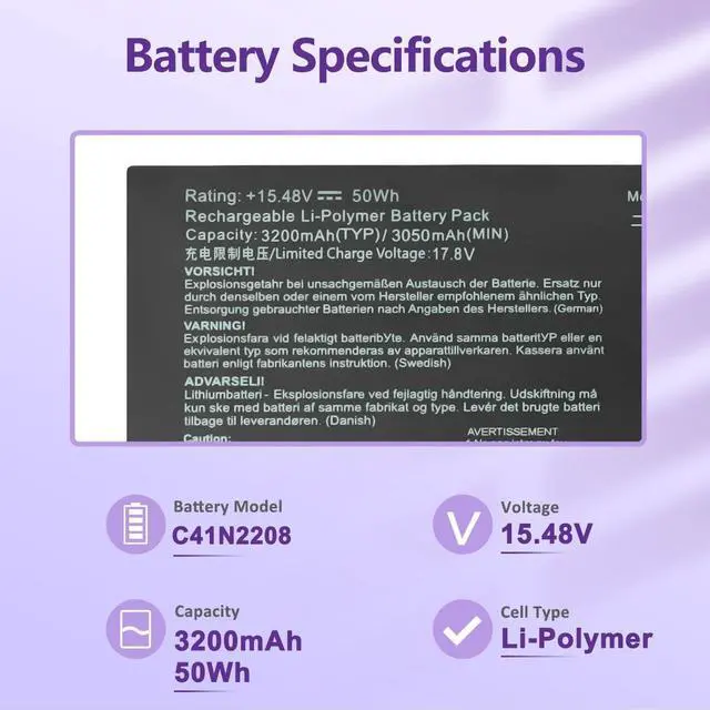 LONG-LASTING BATTERY LIFE: With 15.48V, capacity (50Wh/3200mAh), the (C41N2208) battery ensures all-day power for your laptops in a factory-fresh, never-used battery pack designed for maximum performance.