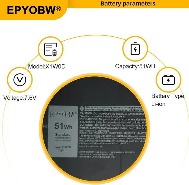 • SpecificationsBattery Model: X1W0D / Voltage: 7.6V / Capacity: 51Wh 6375mAh 4-Cells / Color: Black / Condition: Brand New.