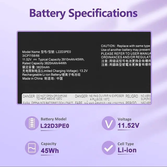 Long-Lasting Battery Life: With 11.58Vcapacity (45Wh/3890mAh), the (L22D3PE0 ) battery ensures all-day power for your laptops in a factory-fresh, never-used battery pack designed for maximum performance.