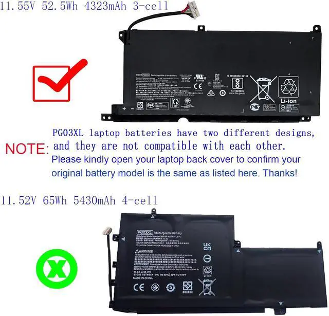 • Replacement for Part NumberPG03XL HSTNN-OB1I HSTNN-DB9G L48495-005 L48430-AC1 L48430-AC2 (NOTE: PG03XL has two different designs(52.5Wh and 65Wh), they are not compatible with each other, please make sure the original battery is the same as the picture before purchase.)