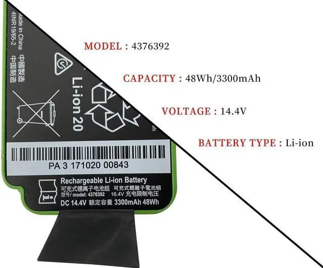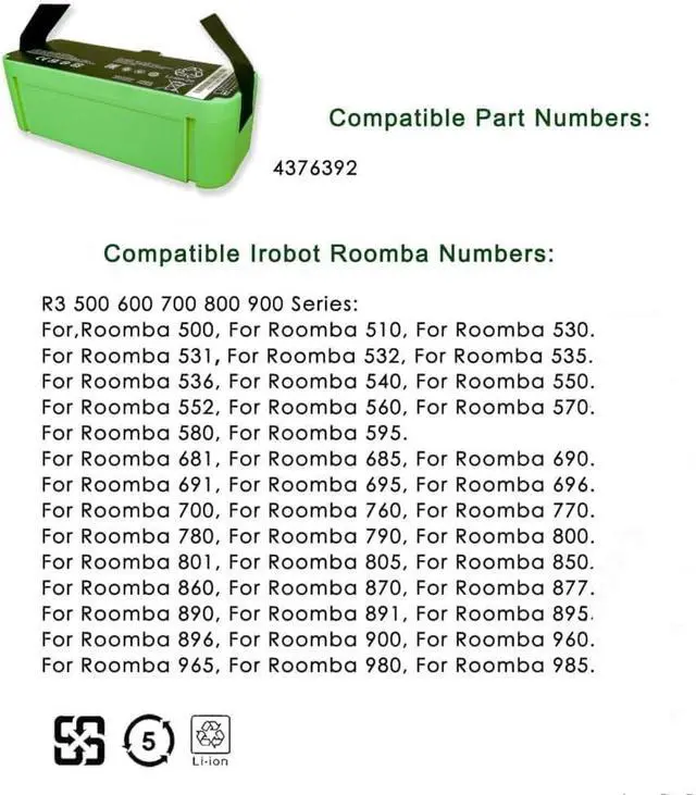 14.4V 48Wh 3300mAh 4376392 1800LI Laptop Battery Compatible for iRobot Roomba 960 980 981 970 965 801 805 850 860 877 890 891 895 695 690 685 680 677 675 671 670 665 652 640 614 615