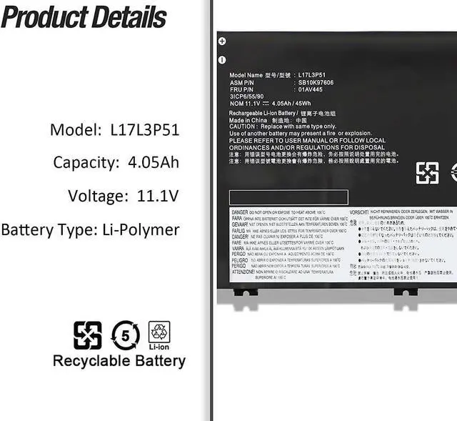 45Wh L17L3P51 L17C3P51 Compatible for Lenovo ThinkPad E480 E485 E490 E495 E580 E585 E590 E595 E14 E15 01AV445 01AV446 01AV447 01AV448 L17M3P52 L17M3P51 SB10K97607