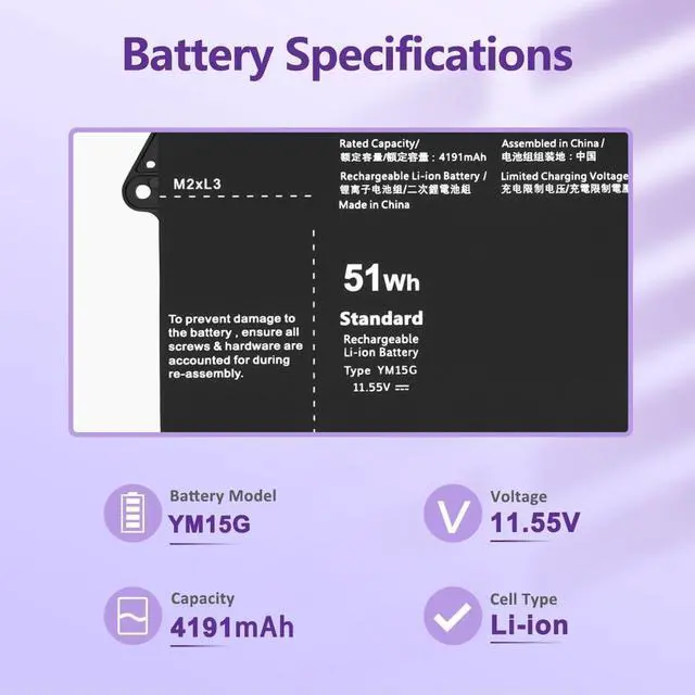 LONG-LASTING BATTERY LIFE: With 11.55Vcapacity (51Wh/4191mAh), the (YM15G) battery ensures all-day power for your laptops in a factory-fresh, never-used battery pack designed for maximum performance.